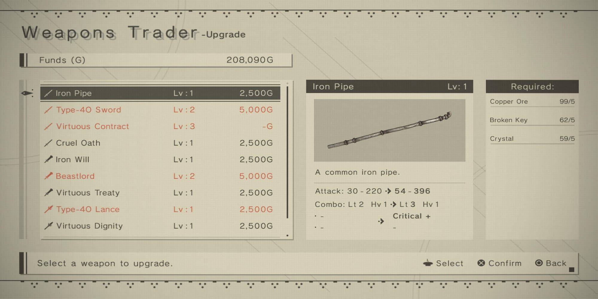 아무리 업그레이드를 해도 쇠파이프의 데미지 범위는 매우 크다. 즉, 공격에 운이 좋다면 이 무기는 게임에서 가장 높은 피해량을 낼 수 있으며 게임 초반에 획득할 수 있습니다. 쇠파이프 업그레이드 요구사항 및 최종 속성은 다음과 같습니다.
