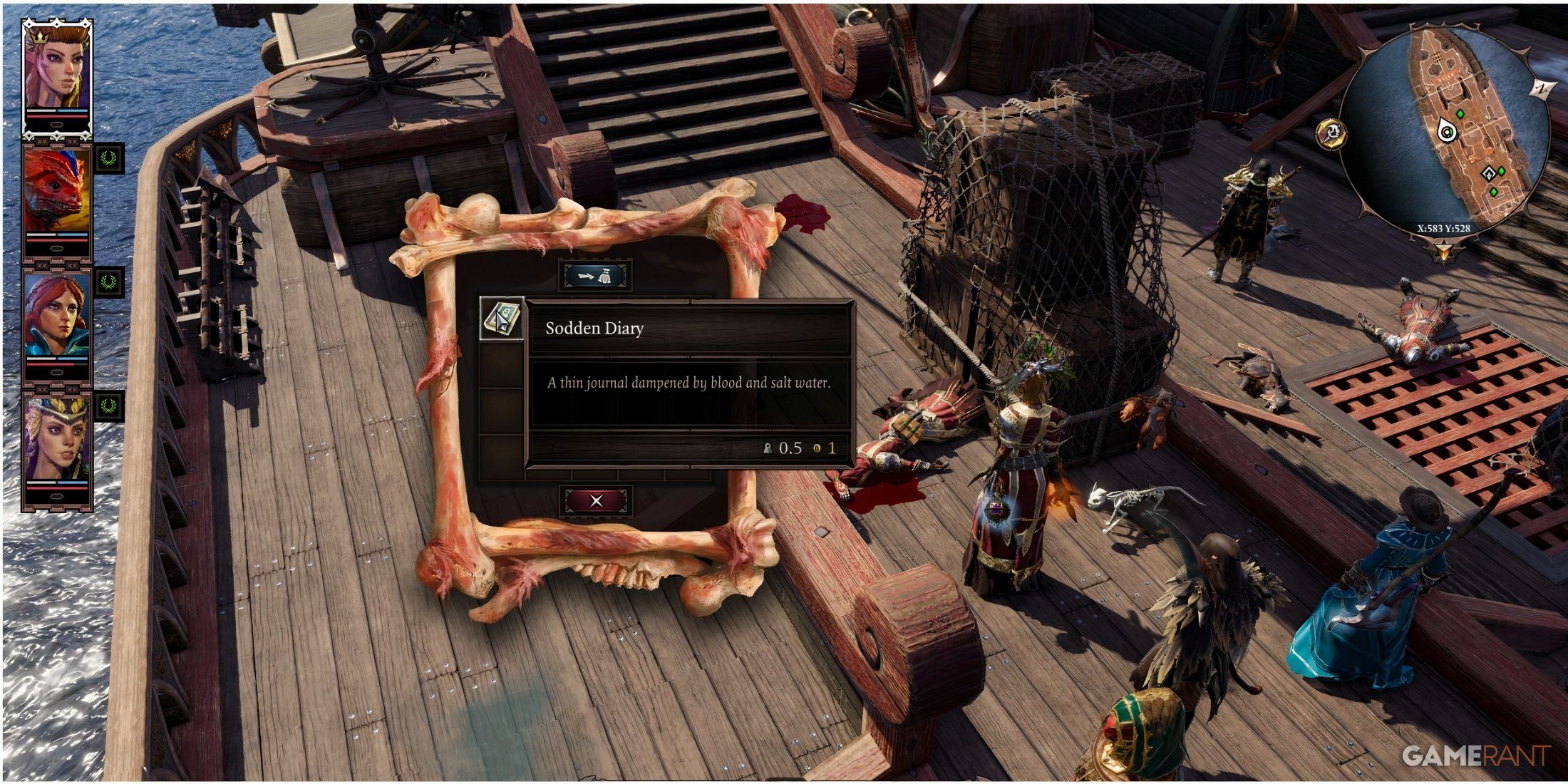 首先要在甲板上搜索魔術師和鬼魂的屍體。 屍體上的濕日記提供了一個客艙門的密碼。 北部客艙門上的技能檢查也可能顯示此密碼。稍後您還需要一個奇怪的寶石。 附近的魔術鏡允許分解字符。找到港口的客廳