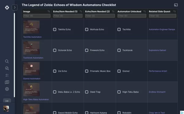 玩家们广泛使用了我们的《智慧的再现》收集清单,我们可以分享,磐石、桌子和史莱姆回声是总体上最常被收集的回声。我们也惊讶地发现许多玩家完全跳过了达姆佩的自动机器人支线任务!随着Switch 2上的分辨率与帧率升级,值得重温游戏以招募所有六位机械助手。我们用一个便于使用的、可排序和可筛选的表格简化了这个过程。